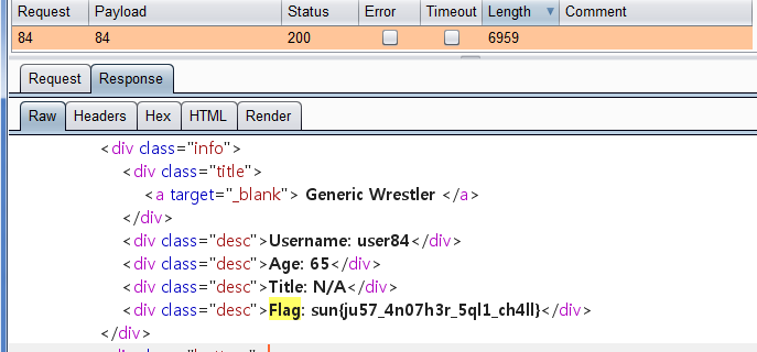 Intruder 결과 user84에 Flag가 존재하였다.