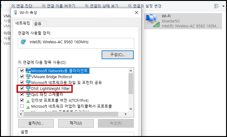 아래 사진에서 확인하는 것처럼 인터넷을 사용하고 있는 장치의 속성에 들어가서 [DNE LightWeight Filter]라는 항목의 체크를 해제해준다.