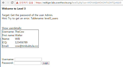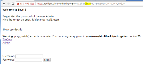 Show userdetails에 있는 [TheCow] 또는 [Admin]을 클릭하면 usr 파라미터 뒤에 이상한 글자들이 들어간다. Base64라 판단하여 디코딩해본 결과