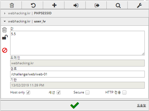 크롬의 EditThisCookie를 이용하여 user_lv의 값을 5.5로 세팅하고 다시 문제에 접근하면?