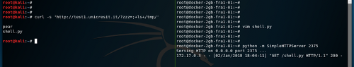 취약한 파라미터에 직접적으로 쉘을 얻기 위해 시도하는 것 대신에, curl 또는 wget을 사용하여 쓰기 가능한 디렉토리에 Python 리버스 쉘을 업로드 할 수 있다. 먼저, 파이썬 코드를 준비한다 vi shell.py :