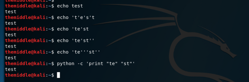 이것은 모든 가까운 문자열 리터럴이 Bash에서 연결되기 때문에 발생하는 것이다.사실 'te's't' 는 세개의 문자열로 구성되어 있다 : 문자열 te, 문자열 s 그리고 문자열 t. 이 문법은 "일치하는 구문:에 기초한 필터(혹은 웹 방화벽 룰)을 우회할 때 사용될 수 있다. (예를 들어, ModSecurity에서 pm 연산자)