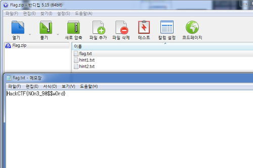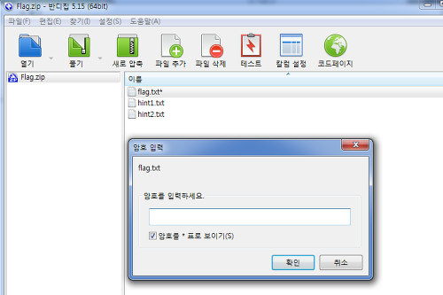 제공해준 zip 파일을 다운받아 열면 flag.txt 파일이 존재하는데 해당 파일을 읽으려하면 암호를 입력하라고 한다.