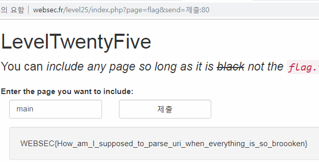 이는 websec.fr/level25/index.php?page=flag&:1과 같이 반드시 파라미터형태로 전달해주지 않아도 bug가 발생한다.